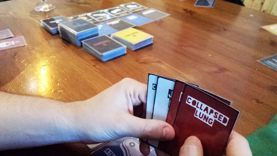 Death Wish is a light-hearted party card game where the goal is to be the first player to die from fictional diseases. Truly a game you're dying to win. Players take turns to collect matching symptoms and afflicters with the aim of contracting the diseases displayed on the table. Diseases are always changing on the table so it’s a race before they’re snapped up by other players. The colors play a part in the game with white strains the most common, less harmful types contrasted with the rare and deadly reds. Share your weird diagnosis! Contract a disease and declare the the disease you caught, how you caught it and the terrible combination of symptoms you are suffering from. With over 240 different diseases, afflicters and symptoms, the combinations are vast. Does your disease have an outbreak? Read out an outbreak card to the group. Outbreaks allow events such as mutating diseases, puking on players or even de-fibrillating someone back to life. These cards have an array of random creative effects that change the dynamic of every game.